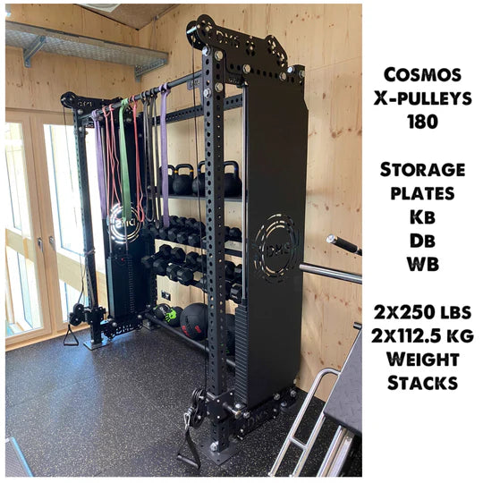 - 1 x 178 Cosmos Cross Pulley with plate storages + pull up Bar + 250 lbs / 112.5 kg weight stacks on each side