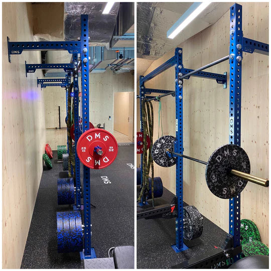 - 2x Deep Blue STD WallMount Tall Racks(274 cm) with safety bars and plate holders